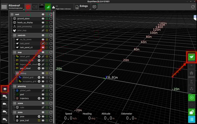 By default ExynView show only displays Task Panel Basic, to show TPv3, open the eyeball menu and set task_panel_v3 to visible, once that's done you'll see the paper airplane appear in the flight controls menu in the bottom-right.
