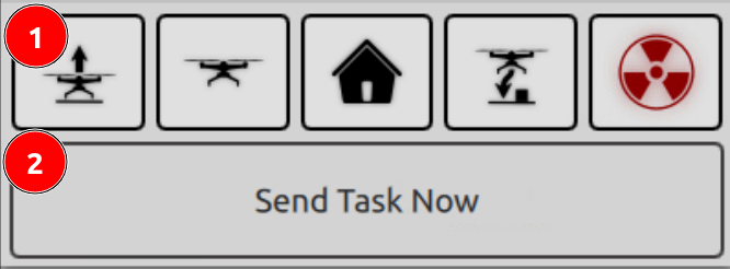 You'll see a similar page to the mission control page—with the addition of two new buttons: Takeoff (1) and "Send Task Now" (2). In addition, only a single mission objective, numbered 0, will be visible.