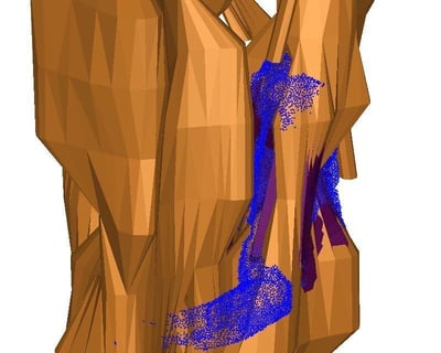 Image of ore body (orange) overlaid with point cloud (blue) and stope plan (purple), showing an overbreak into the ore body that resulted in additional ROI.